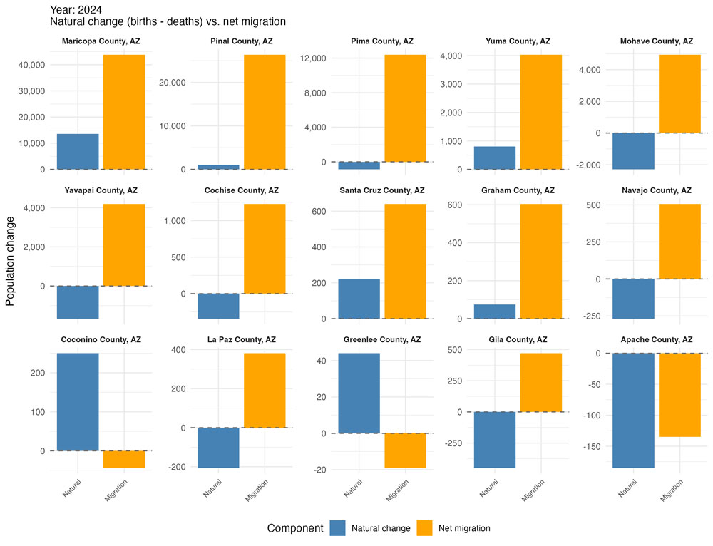 This layout makes it easy to scan dozens of counties at once and quickly spot patterns: which counties are migration-driven, which rely on natural growth, and which face challenges on both fronts. Counties with large orange bars but small or negative blue bars are particularly reliant on attracting new residents for growth.