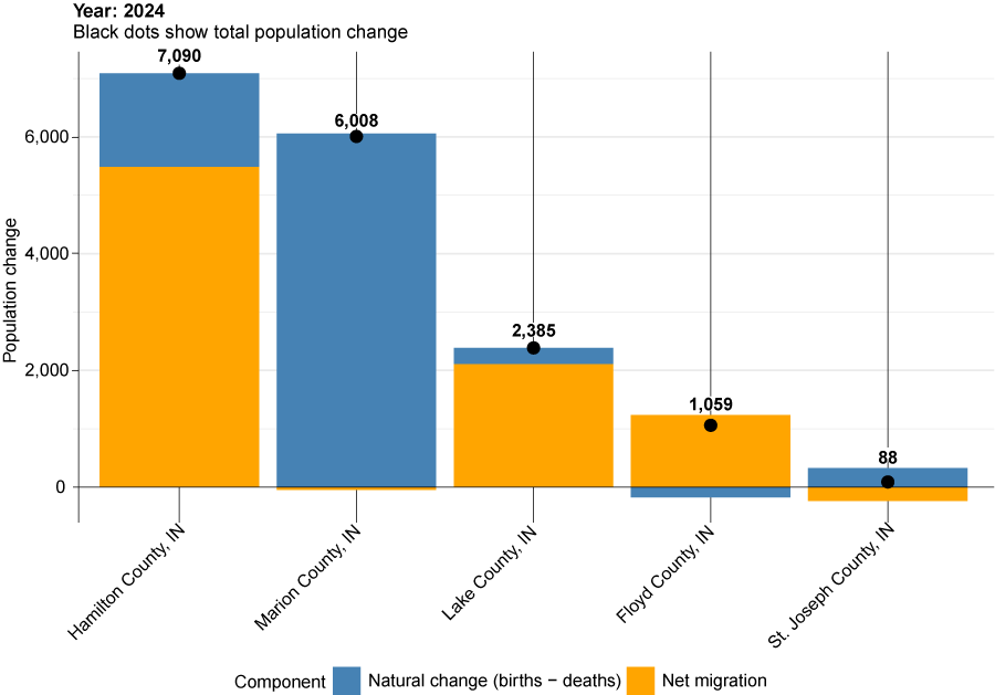 A county with negative natural change (more deaths than births) but positive net migration is reliant on newcomers for growth (e.g., Floyd County). A county with a positive natural change but negative net migration is dependent on its population’s fertility for growth (e.g., Marion and St. Joseph counties).